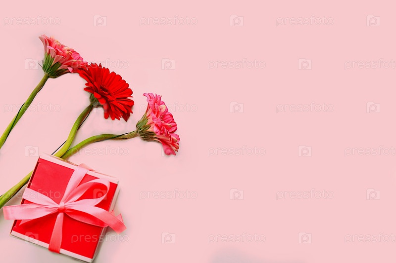Цветочная композиция с герберами на розовом фоне. Концепция ко Дню святого Валентина или Женскому дню, Дню матери, баннеру, поздравлению любимого человека с праздником, днем рождения, минимальный современный дизайн, избирательный фокус