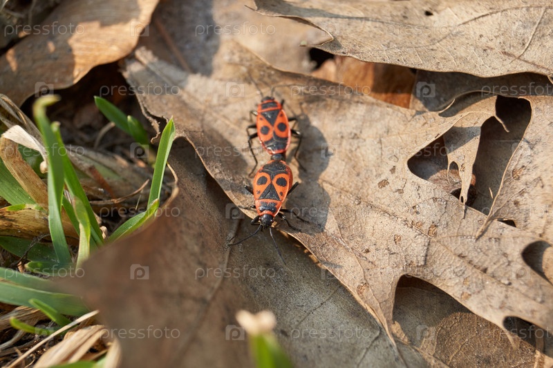 Клоп-солдат (лат. Pyrrocoris apterus) бежит со своими чемоданами по дорожке в саду