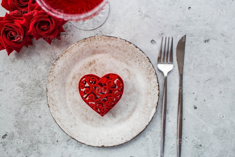 Баннер. Сервировка стола. Стильная керамическая тарелка, бокал красного вина, красные розы, вилка и золотые сердечки на бетонном фоне. Концепция празднования Дня святого Валентина для кафе и ресторанов