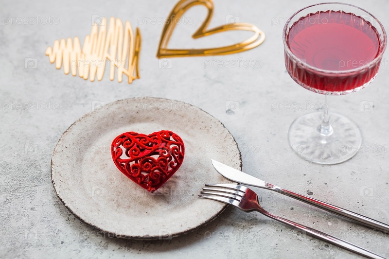 Баннер. Сервировка стола. Стильная керамическая тарелка, бокал красного вина, вилка и золото, красные сердца на бетонном фоне. Концепция празднования Дня святого Валентина для кафе и ресторанов