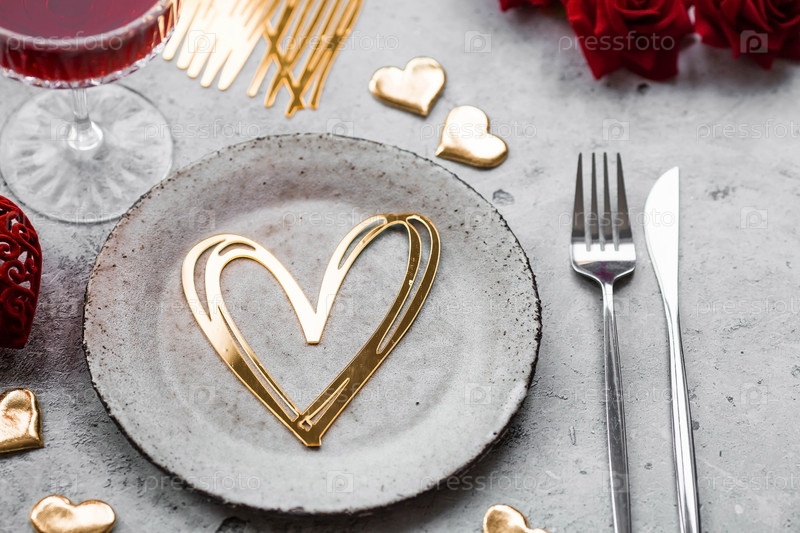 Баннер. Сервировка стола. Стильная керамическая тарелка, бокал красного вина, вилка и золото, красные сердца на бетонном фоне. Концепция празднования Дня святого Валентина для кафе и ресторанов