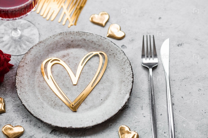 Баннер. Сервировка стола. Стильная керамическая тарелка, бокал красного вина, вилка и золото, красные сердца на бетонном фоне. Концепция празднования Дня святого Валентина для кафе и ресторанов