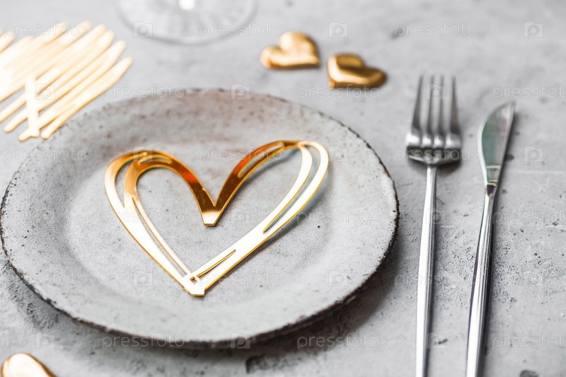 Баннер. Сервировка стола. Стильная керамическая тарелка, бокал красного вина, вилка и золото, красные сердца на бетонном фоне. Концепция празднования Дня святого Валентина для кафе и ресторанов