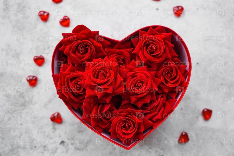 День святого Валентина. Красные розы и золотые сердечки в коробке в форме сердца на бетонном фоне. Подарок женщине на праздник. Концепция доставки цветов. флористика и цветочные магазины