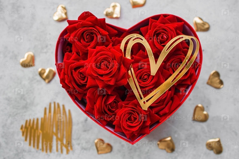День святого Валентина. Красные розы и золотые сердечки в коробке в форме сердца на бетонном фоне. Подарок женщине на праздник. Концепция доставки цветов. флористика и цветочные магазины