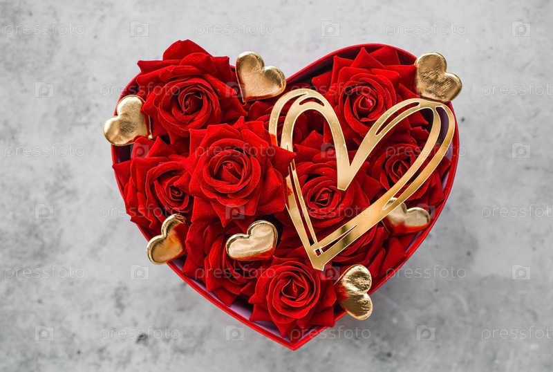 День святого Валентина. Красные розы и золотые сердечки в коробке в форме сердца на бетонном фоне. Подарок женщине на праздник. Концепция доставки цветов. флористика и цветочные магазины
