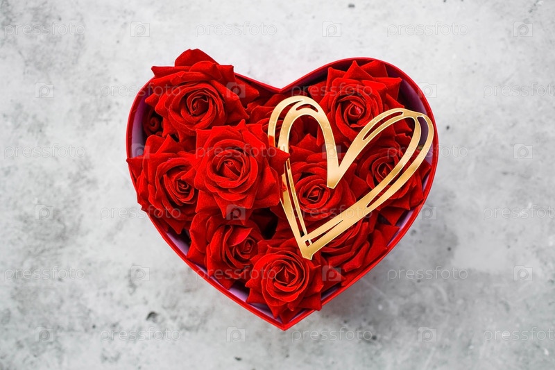 День святого Валентина. Красные розы и золотые сердечки в коробке в форме сердца на бетонном фоне. Подарок женщине на праздник. Концепция доставки цветов. флористика и цветочные магазины