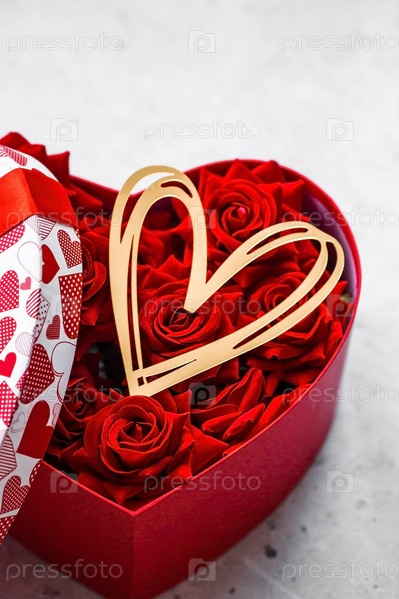 День святого Валентина. Красные розы и золотые сердечки в коробке в форме сердца на бетонном фоне. Подарок женщине на праздник. Концепция доставки цветов. флористика и цветочные магазины