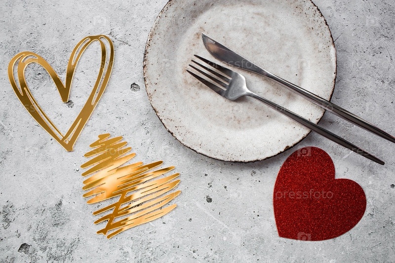 Баннер. Сервировка стола. Стильная керамическая тарелка и золотые, красные сердца на бетонном фоне. Концепция празднования Дня святого Валентина для кафе и ресторанов