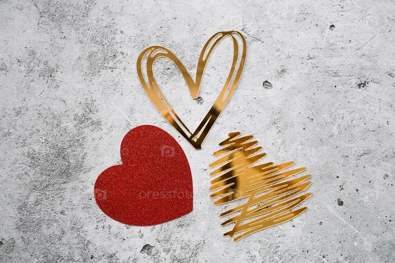 Праздничный фон с красными и золотыми сердечками на сером бетонном фоне. День святого Валентина. Любовь