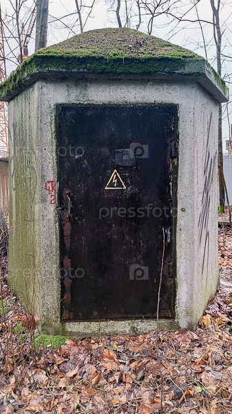 Бетонная конструкция в лесу. Посреди небольшого смешанного леса стоит невысокий цементный дом с черной железной дверью. Над бетонной крышей, поросшей мхом