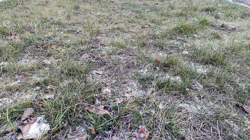 Первый снег на выцветшей лужайке. На невысокой бледно-зеленой траве и опавших бурых листьях местами лежит белый снег. Снег недавно выпал и едва покрыл поверхность земли
