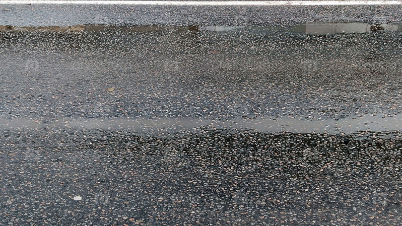 Темно-серый мокрый асфальт. Небольшие лужи на мокром асфальте после дождя. Поверхность серо-белая из-за облаков над головой. В луже отражается серое небо и верхушка неизвестного здания
