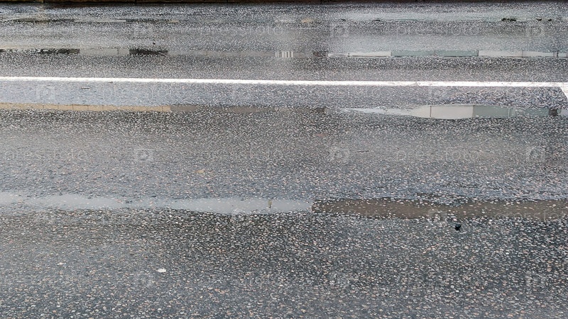 Темно-серый мокрый асфальт. Небольшие лужи на мокром асфальте после дождя. Поверхность серо-белая из-за облаков над головой. В луже отражается серое небо и верхушка неизвестного здания