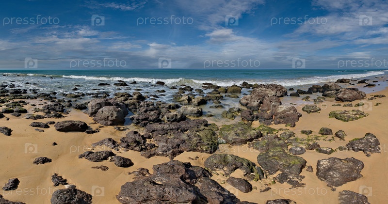 Западная Африка, Сенегал. Песчаный пляж курортной зоны окруженный скалами и обломками горных пород вулканического происхождения