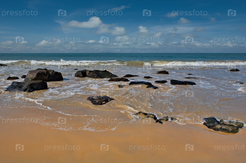 Западная Африка, Сенегал. Песчаный пляж курортной зоны окруженный скалами и обломками горных пород вулканического происхождения