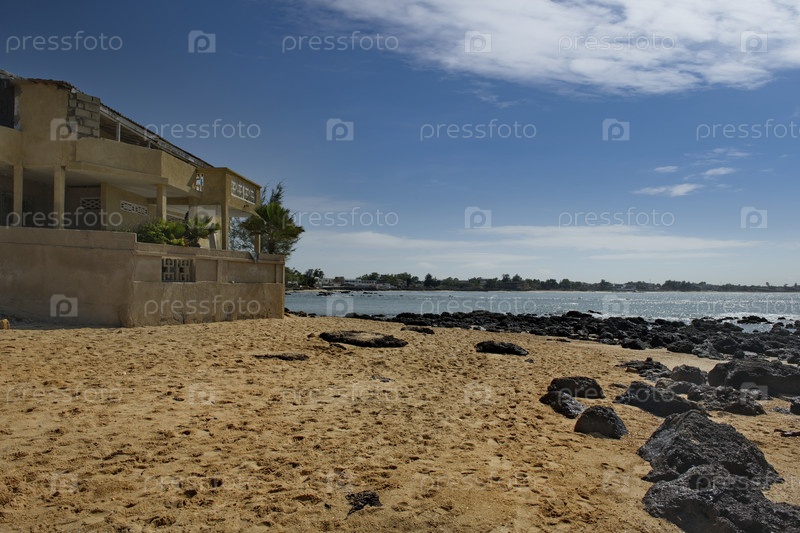 Западная Африка, Сенегал. Песчаный пляж курортной зоны окруженный скалами и обломками горных пород вулканического происхождения