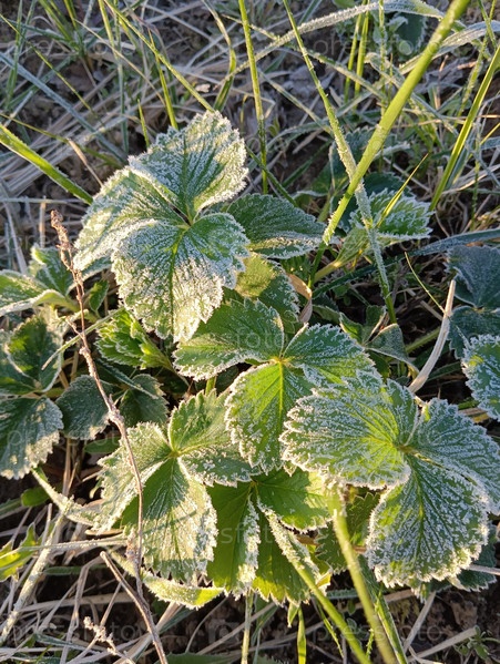 Листья клубники в инее на солнечном рассвете