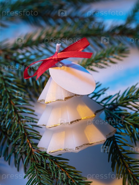 Белая ароматическая свеча в форме декоративной елки на еловой ветке крупным планом