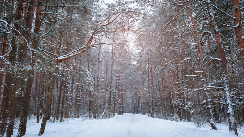 Снежная дорога между деревьями в зимнем сосновом лесу