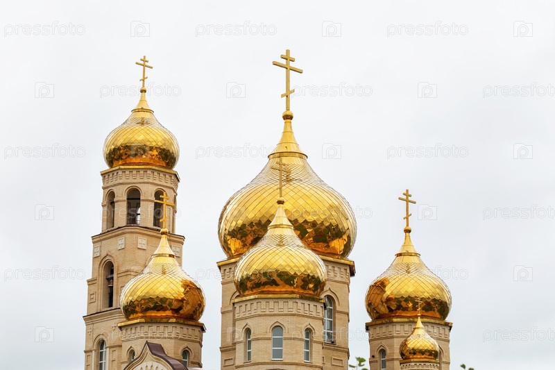 Купола православной церкви на фоне пасмурного неба, крупный план