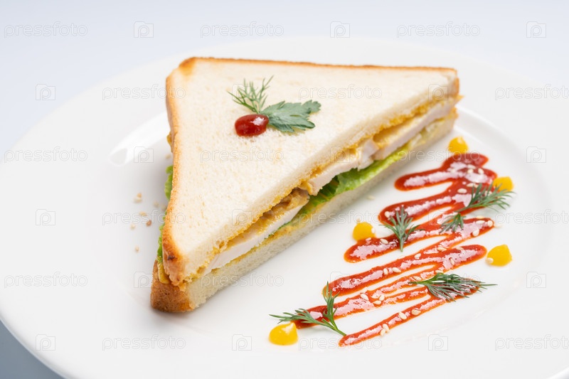 Сэндвич с курицей и зеленью на белой тарелке и белом фоне