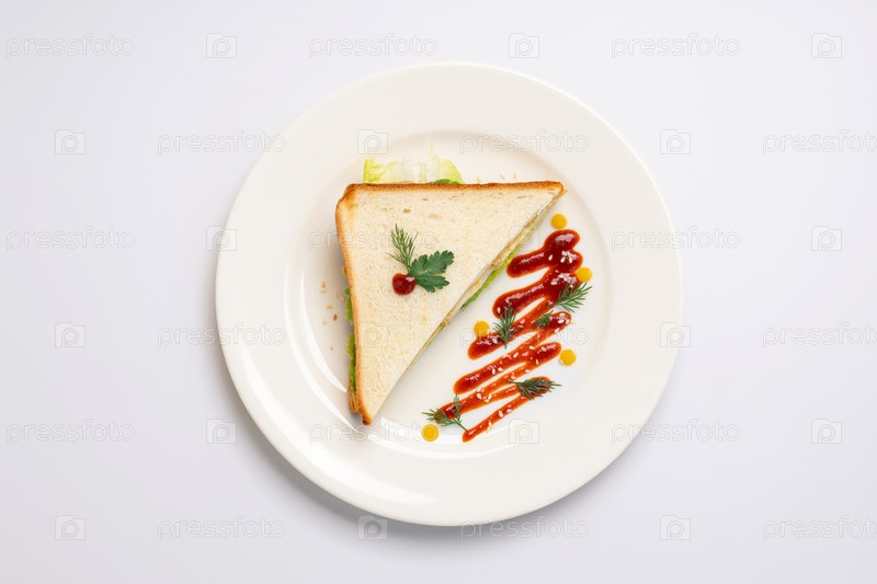 Сэндвич с курицей и зеленью на белой тарелке и белом фоне