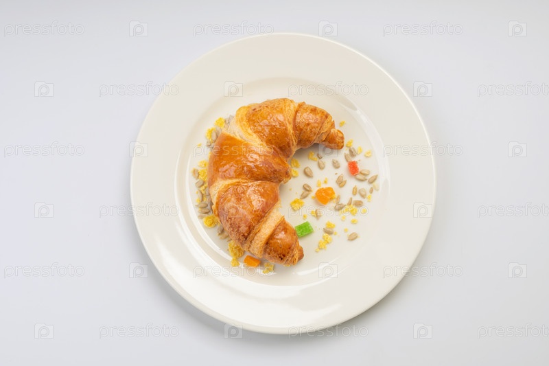 Завтрак. Круассан, семена и сухофрукты на белой тарелке и белом фоне