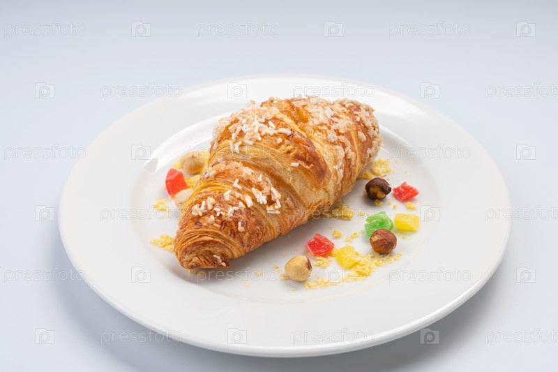 Завтрак. Круассан, семена и сухофрукты на белой тарелке и белом фоне