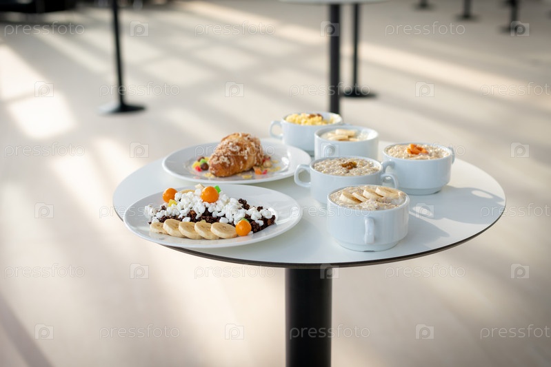 Завтрак. Шведский стол. Завтрак в холле. Различные каши, выпечка в белых тарелках на столе рано утром в зале