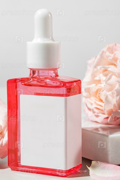 Косметическая бутылочка-капельница с натуральной сывороткой для лица и органическим маслом на подиумах на мраморном фоне с цветами розовых роз. Концепция органической косметики и косметики, благоприятной для кожи. Макет, вид спереди
