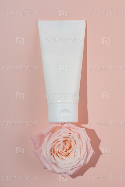 Белый тюбик для косметики без бренда с маленькими розовыми розами на розовом фоне. Макет натурального косметического продукта, концепция брендинга