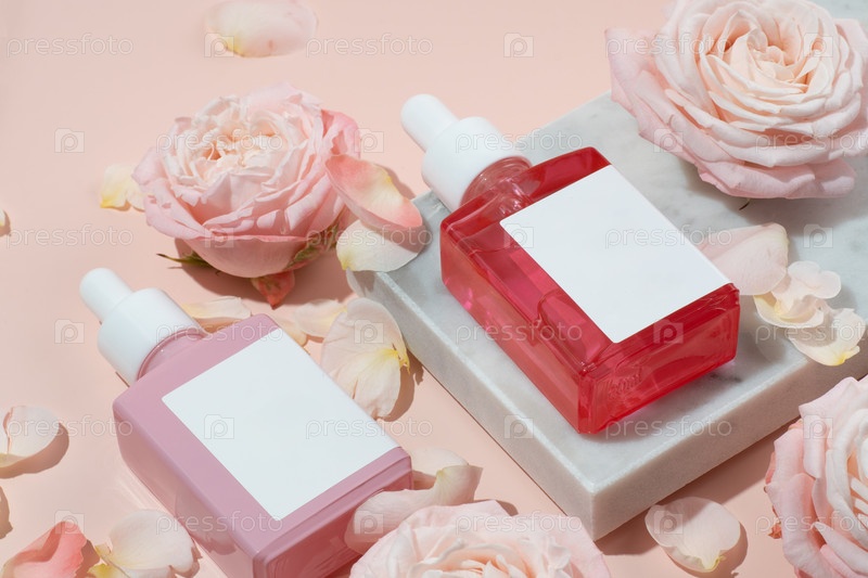 Косметическое масло в квадратных флаконах на мраморном подиуме с розовыми розами. Натуральная органическая сыворотка, средство по уходу за кожей