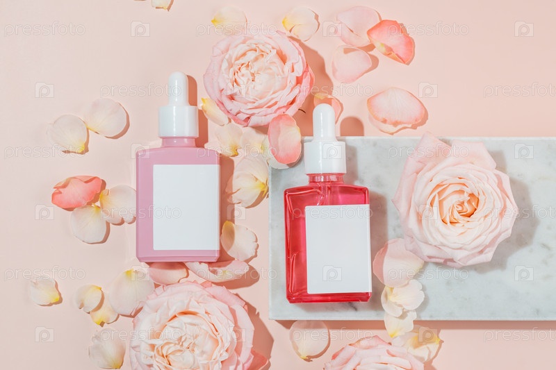 Стеклянные флаконы-капельницы с сывороткой на мраморном подиуме на розовом фоне с нежными розовыми розами и лепестками роз. Натуральный косметический продукт на основе цветков розы, ферментированная косметика
