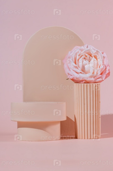 Пустые бежевые подиумы на розовом фоне с цветущим цветком розы. Гипсовый подиум для презентации косметической продукции, монохромный