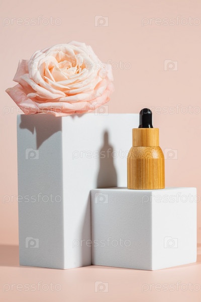 Косметическая бутылка масла для лица на кубическом подиуме с розовыми розами. Органическая сыворотка, средство по уходу за кожей, бренд натуральной косметики. Макет