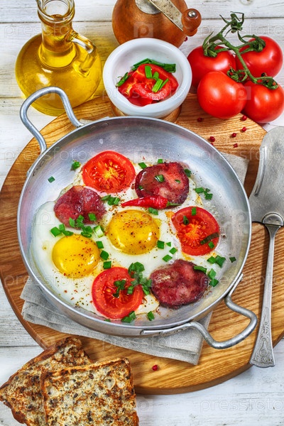 Яичница с колбасой и помидорами на деревянном фоне