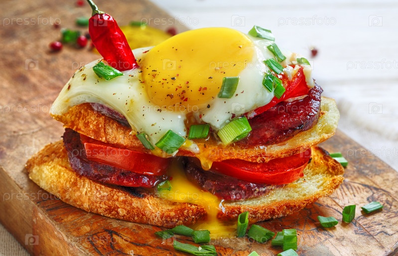 Бутерброд с яичницей,колбасой и помидорами