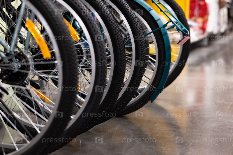 Магазин велосипедов, ряды новых велосипедов, магазин велосипедов