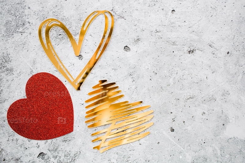 Праздничный фон с красными и золотыми сердечками на сером бетонном фоне. День святого Валентина. Любовь