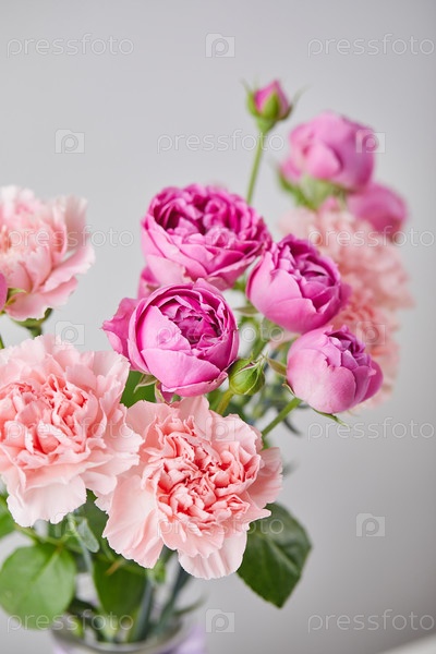 Букет из сиреневых роз и розовых гвоздик. Крупным планом