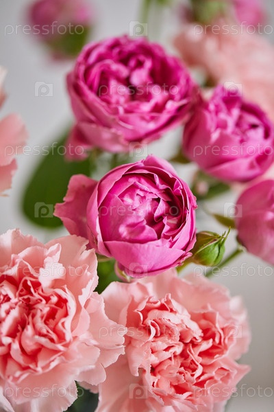 Букет из сиреневых роз и розовых гвоздик. Крупным планом