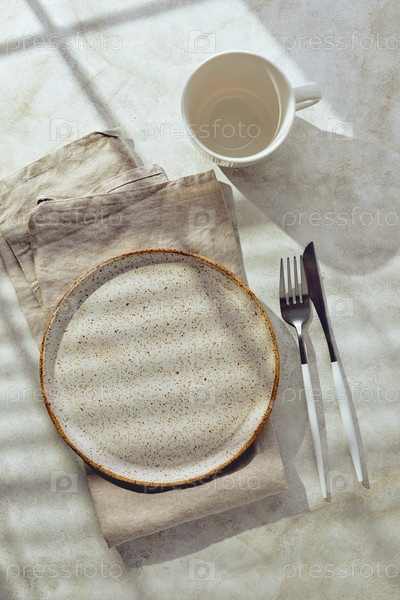 Пустая тарелка, столовые приборы и салфетка на светлом фоне. Сервировка стола на столе. Вид сверху