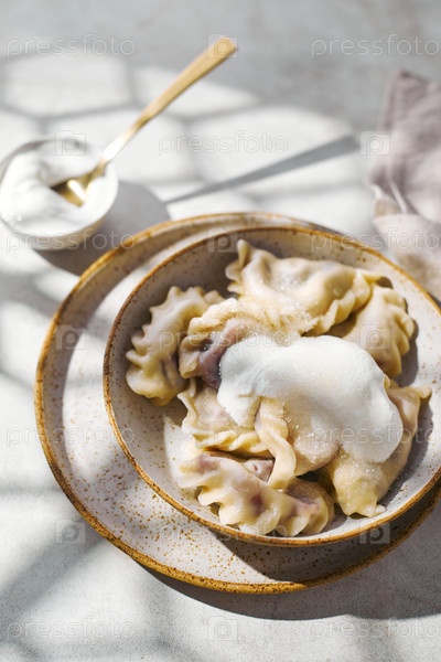 Вареники с вишней со сметаной и сахаром. Традиционное блюдо русской, украинской, белорусской кухни, известное как Вареники