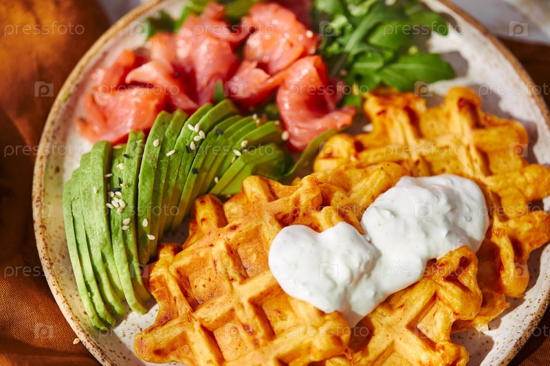 Сытные вафли из сладкого картофеля или тыквы с авокадо, лососем, рукколой и соусом