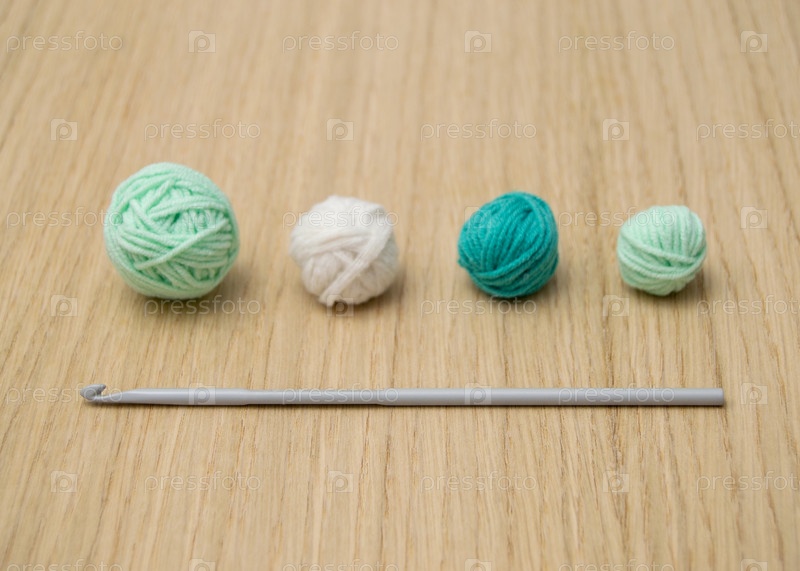 Серый вязальный крючок лежит на деревянном столе. Рядом с ним в один ряд лежат клубки пряжи сине-зеленого, светло-зеленого и молочного цвета