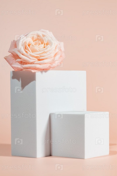 Пустой подиум с розовыми розами на розовом фоне. Витрина для презентации продукции, парфюмерии, ювелирных изделий и косметики, макет для дизайна