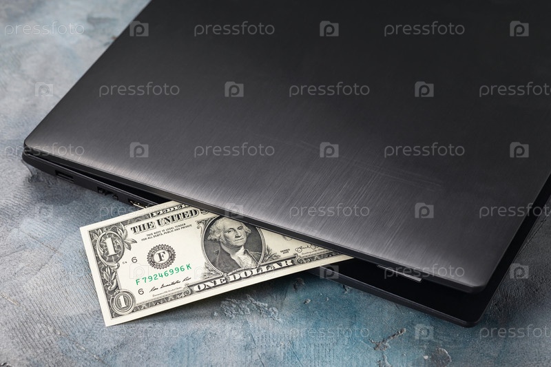 Доллар, торчащий из ноутбука, концепция на тему удаленной работы