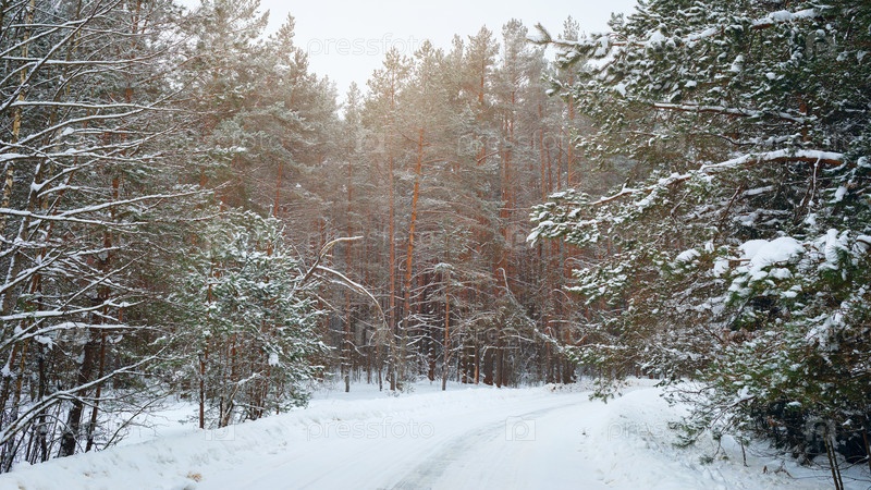 Дорога и деревья в снегу в сосновом лесу, загородная зимняя поездка