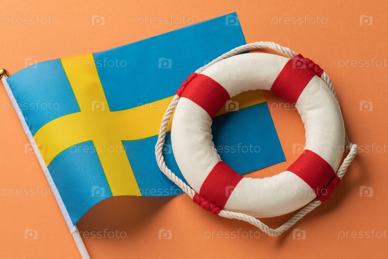 Спасательный круг и флаг Швеции на цветном фоне, концепция на тему помощи